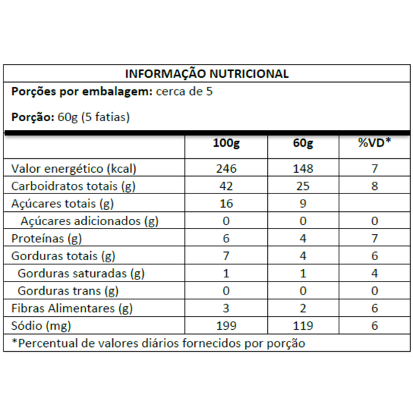 Leite de inhame orgânico, farinha de trigo orgânica, ovo caipira orgânico, tâmara, óleo de girassol e fermento orgânico.