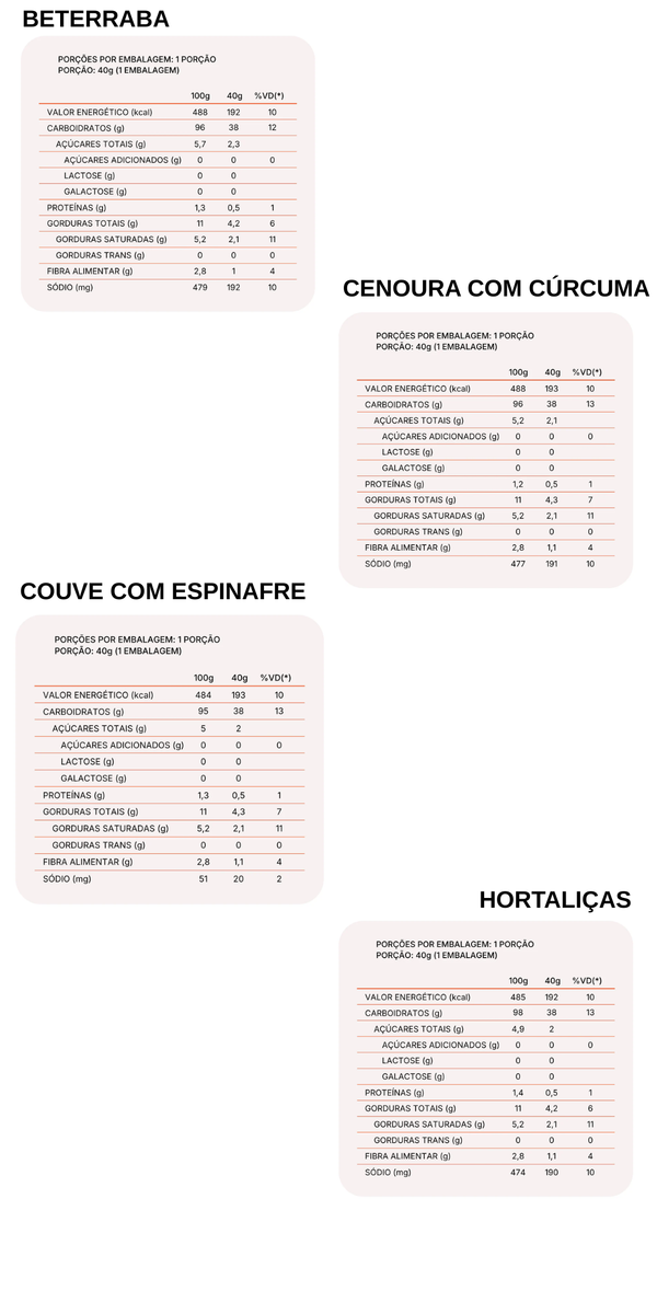 São quatro sabores deliciosos. E o Mix que contempla os sabores Beterraba, Cenoura e Hortaliças em um único pacote.