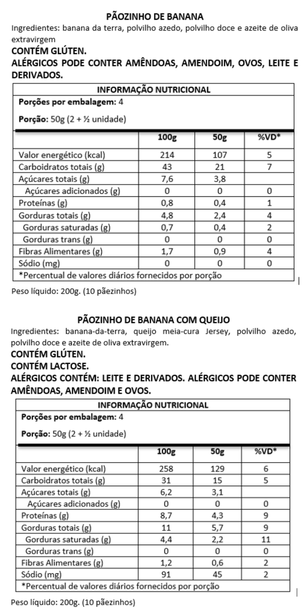 Pãozinho de banana: banana-da-terra orgânica, polvilho azedo, polvilho doce e azeite de oliva extravirgem.