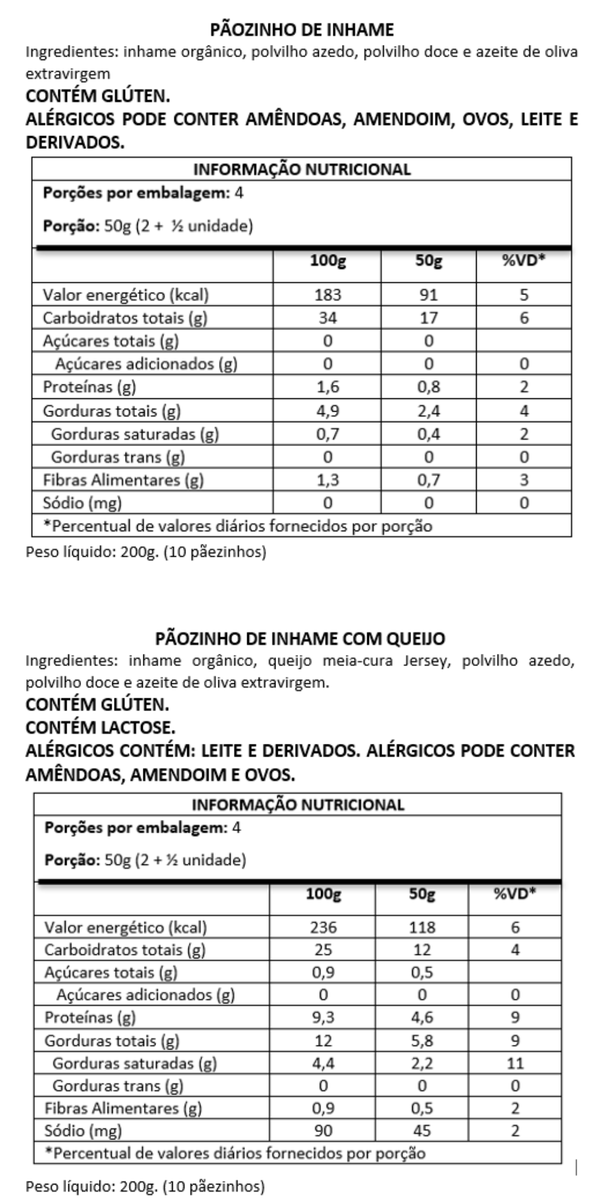 Pãozinho de inhame: inhame orgânico, polvilho azedo, polvilho doce e azeite de oliva extravirgem.