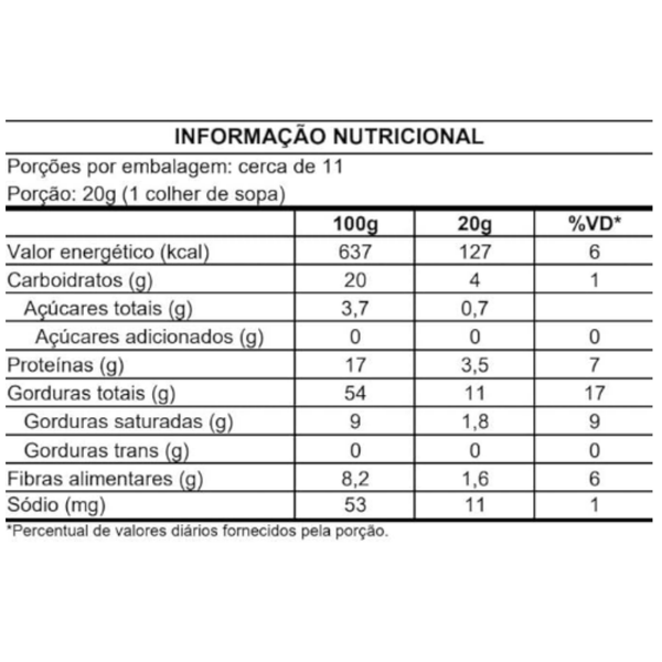 Castanha de caju, castanha do pará, amêndoa, nozes, semente de girassol, semente de gergelim e semente de linhaça.