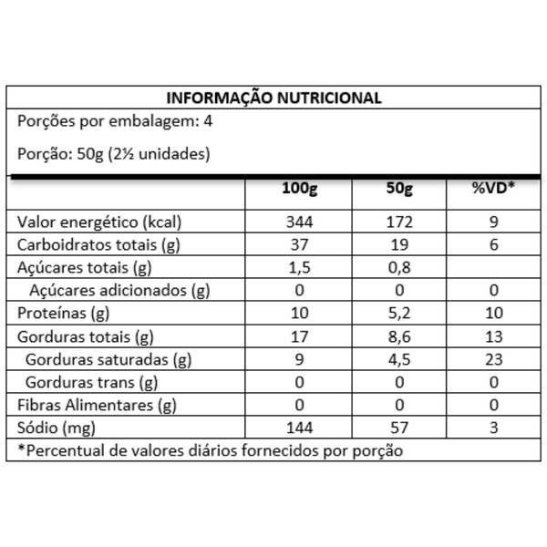 Para consumir, basta tirar do freezer e colocar direto no forno a gás pré-aquecido, elétrico ou airfryer por cerca de 10 minutos.