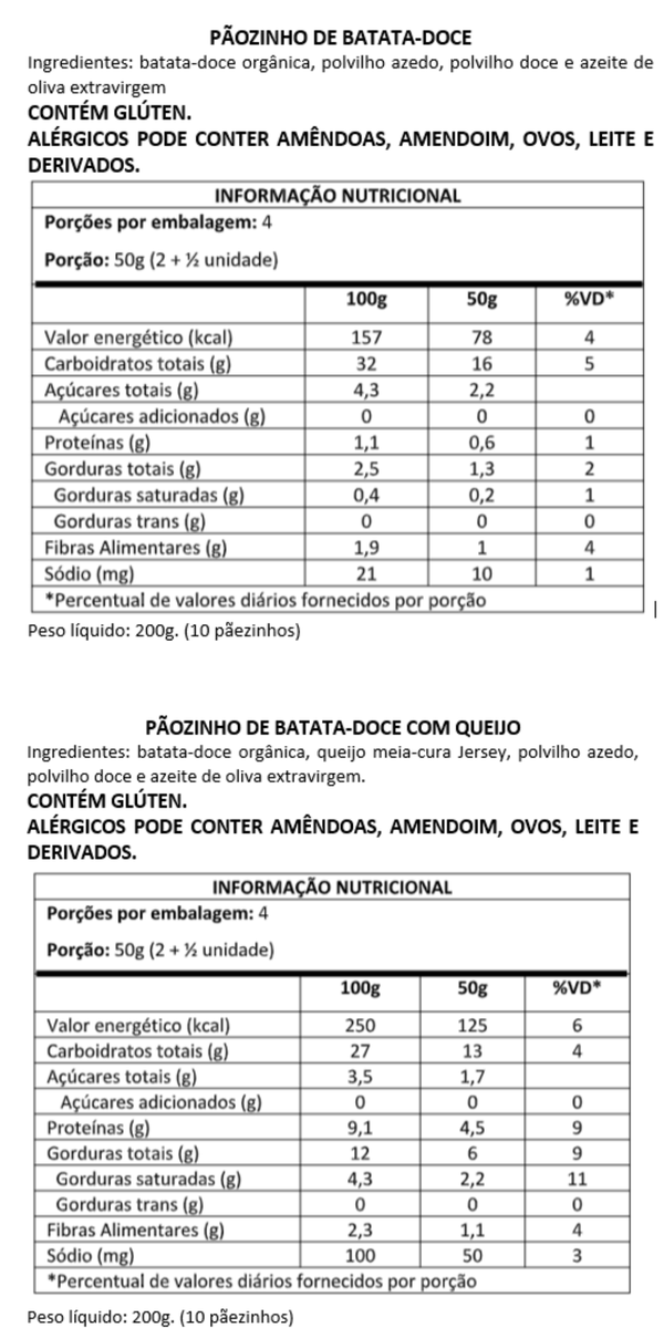 Pãozinho de batata-doce com queijo: batata-doce orgânica, queijo meia-cura Jersey, polvilho azedo, polvilho doce e azeite de oliva extravirgem.