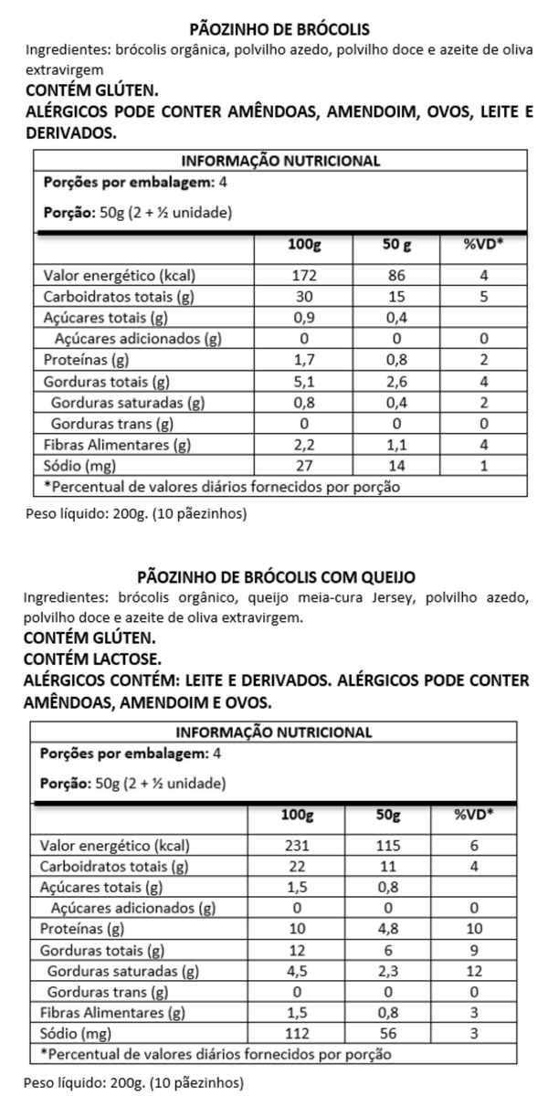 Pãozinho de brócolis: brócolis orgânico, polvilho azedo, polvilho doce e azeite de oliva extravirgem.